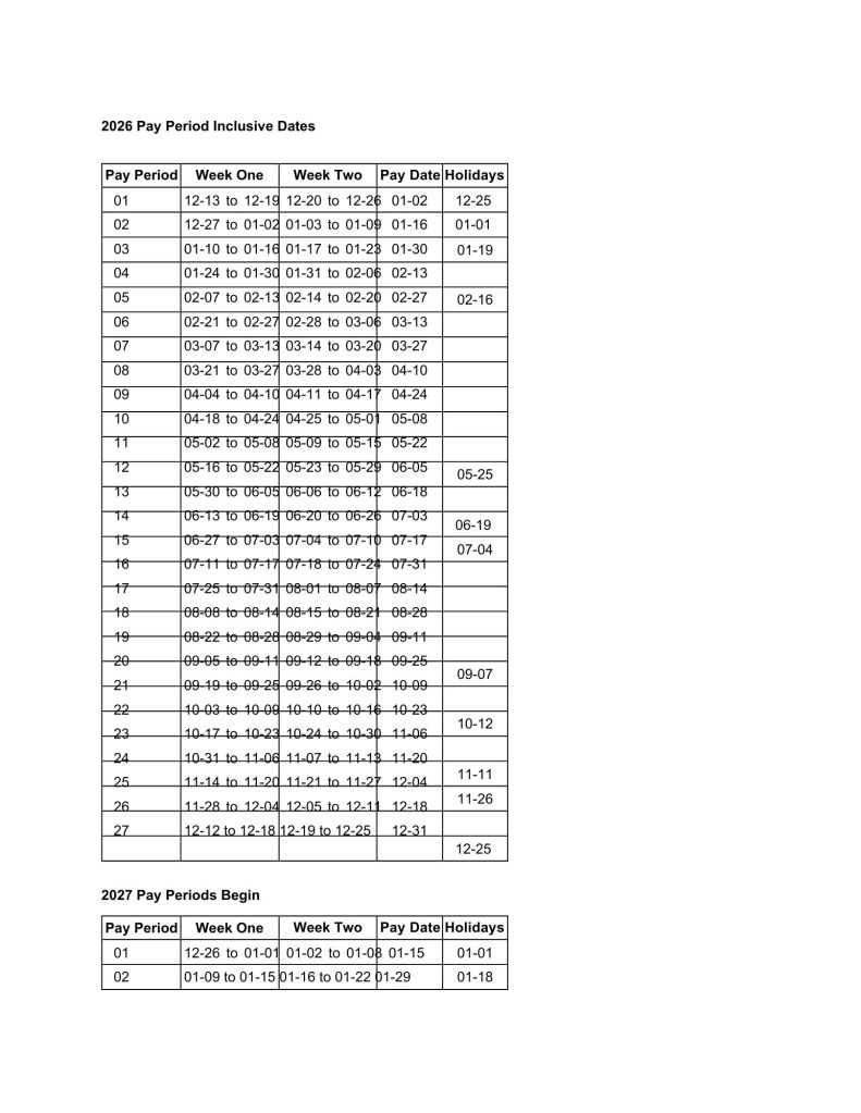 USPS 2026 Pay Schedule December 29, 2025January 23, 2026 Patt NewsPay Schedule The Pay Schedule for 2026 has been released by the USPS. See image below. This is also included in the color coded. Discover more from Subscribe to get the latest posts sent to your email. Type your email… Subscribe Share this: Share on X (Opens in new window) X Share on Facebook (Opens in new window) Facebook Like Loading... Related